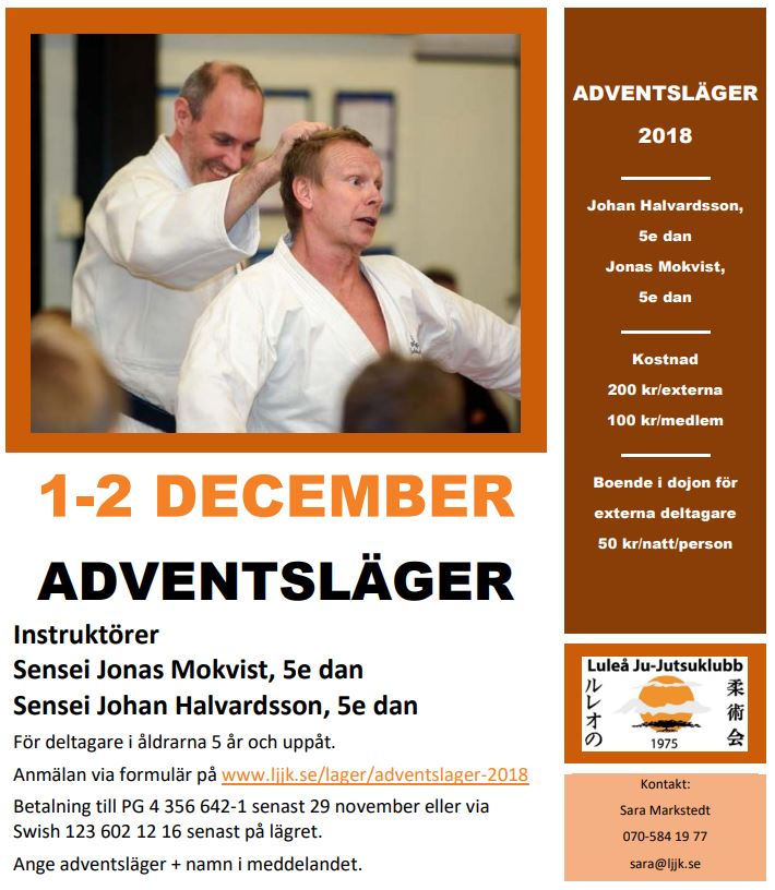 Adventsläger 2018 Förbundsinstruktörerna Johan Halvardsson, 5e dan och Jonas Mokvist, 5e dan till Luleå för det populära adventslägret. För alla medlemmar mellan 5-13 år. Även externa deltagare är välkomna att komma och träna. Anmälan till läger gör du här